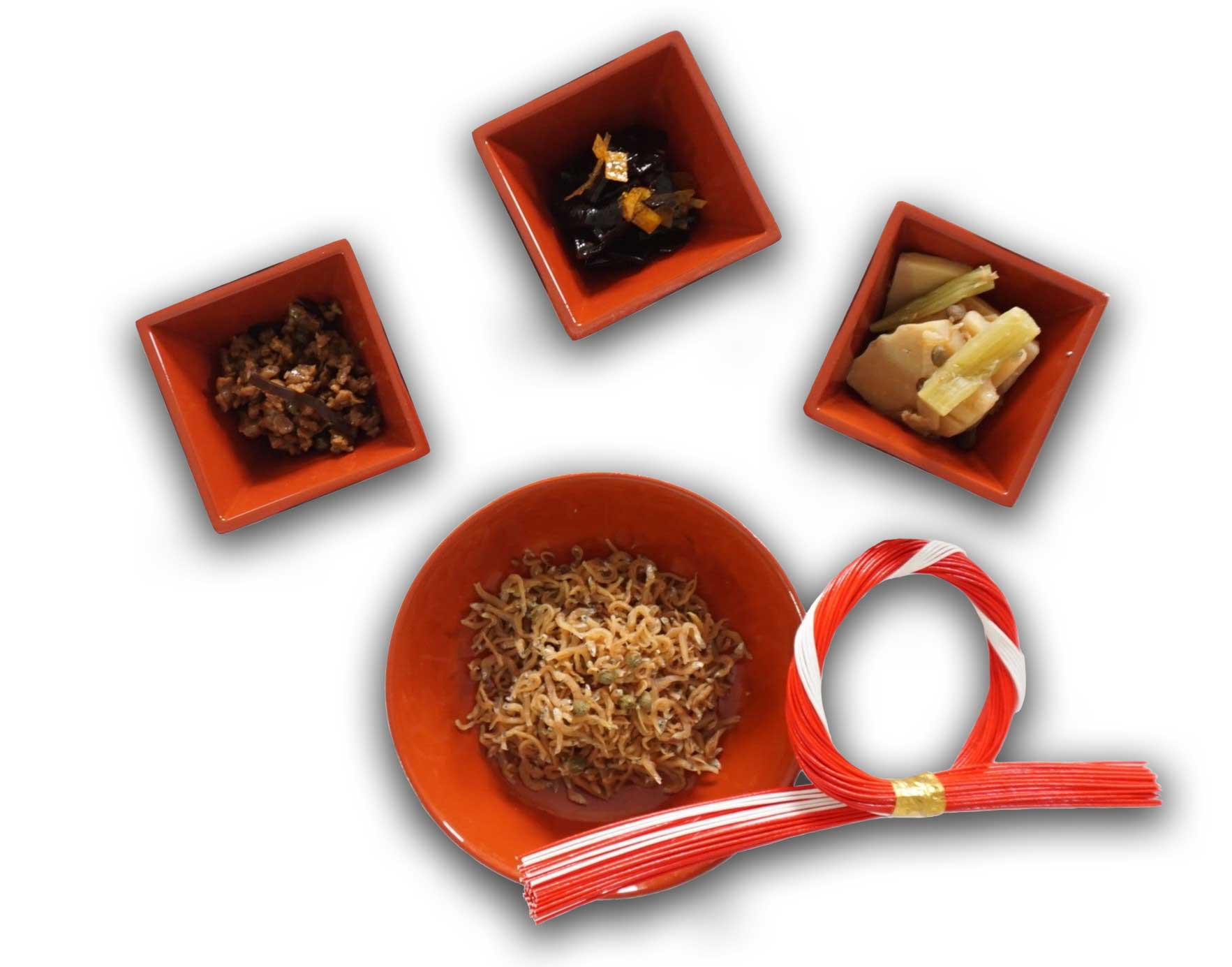 セット内容 : おじゃこ60g、柚子こんぶ120g、筍100g、あかね麩90g